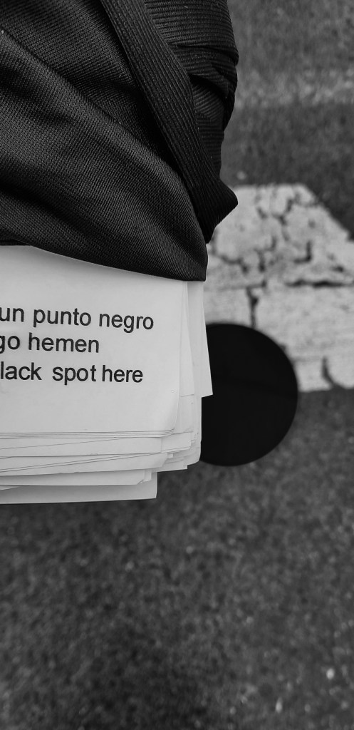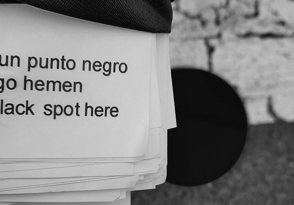 Las octavillas hacen referencia a la existencia de un punto negro en dicho paso. Ese punto negro existe, es un círculo pintado sobre la calzada en el lugar exacto en el que fue arrollada mi hija. Se produce, por tanto, cierta ambigüedad: el texto de la octavilla se puede tomar en su sentido literal pero también en sentido figurado, con referencia en tal caso a un lugar ominoso.