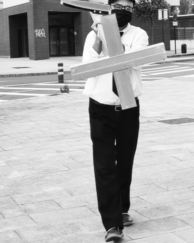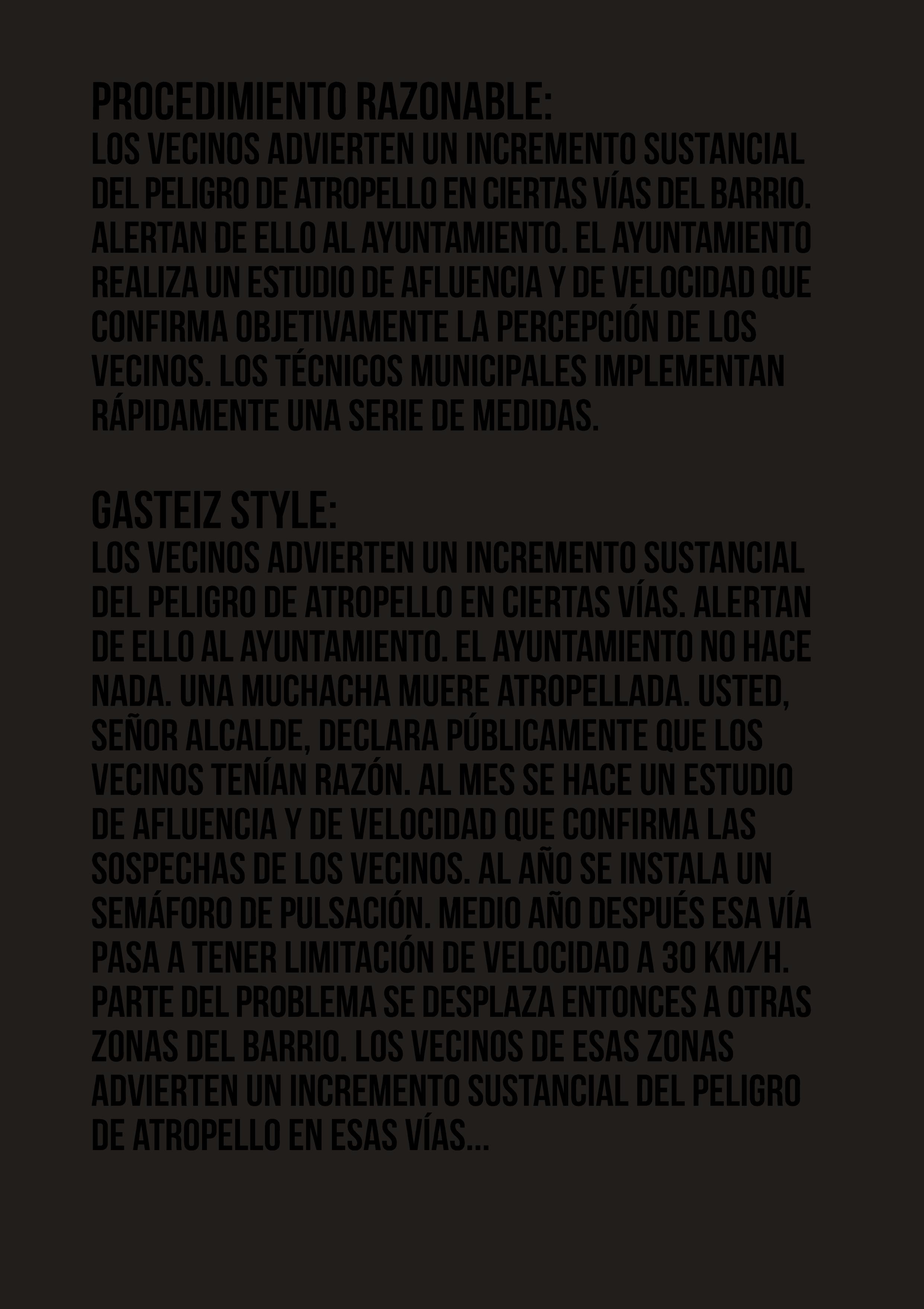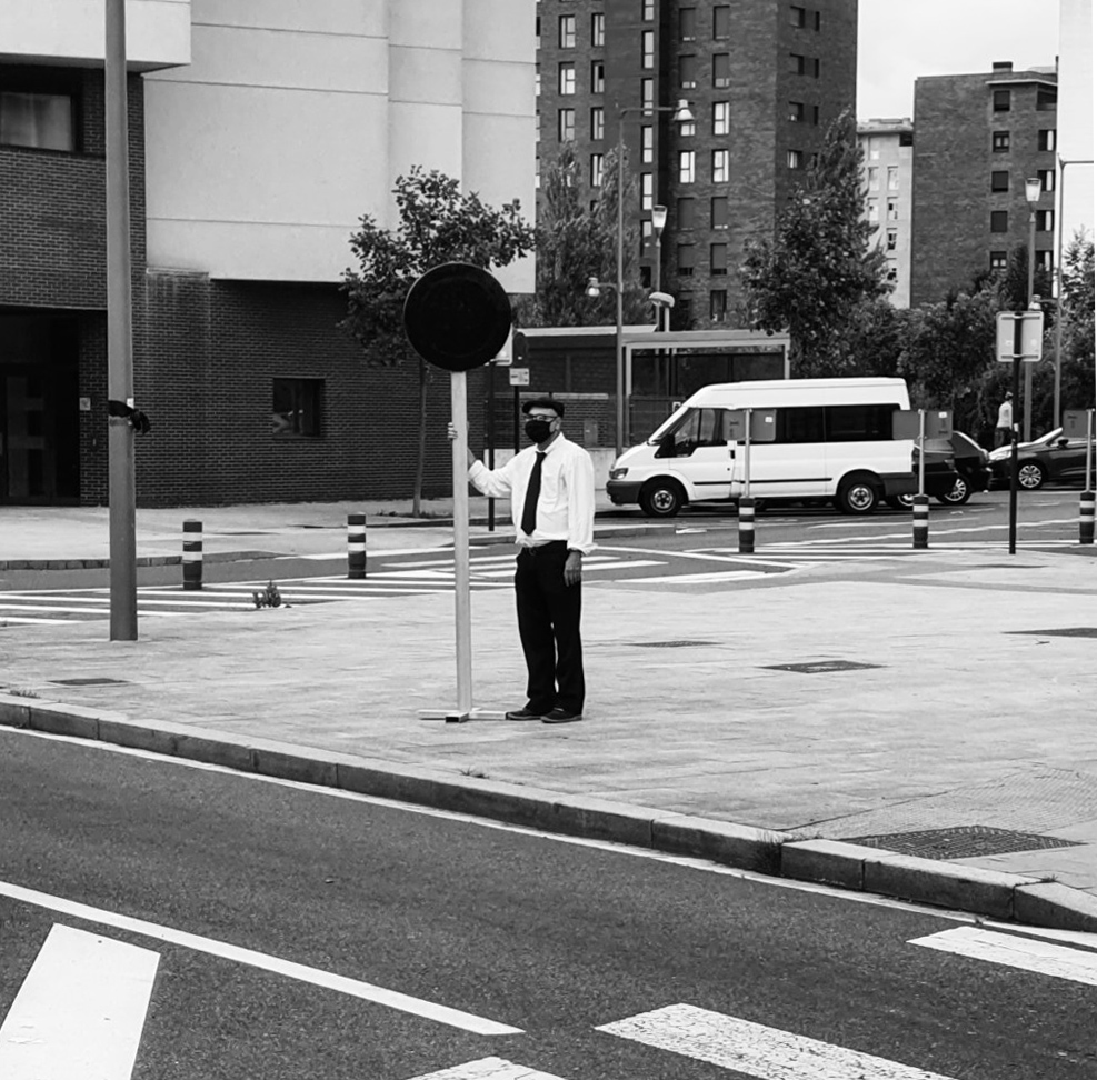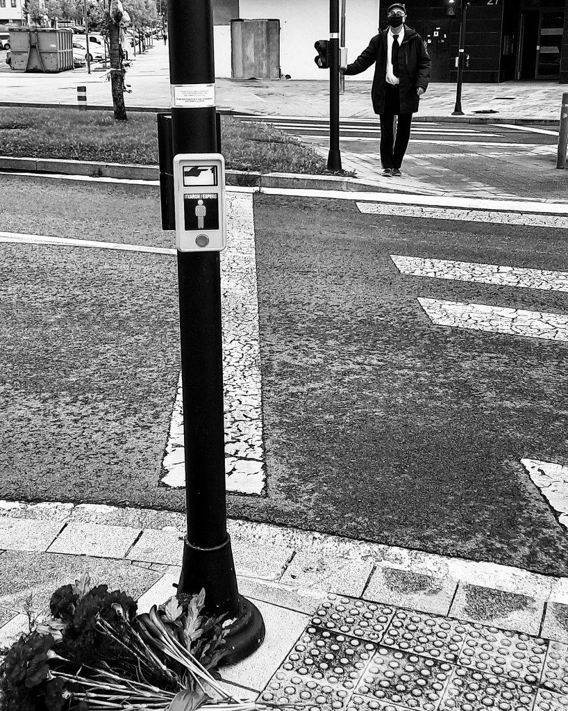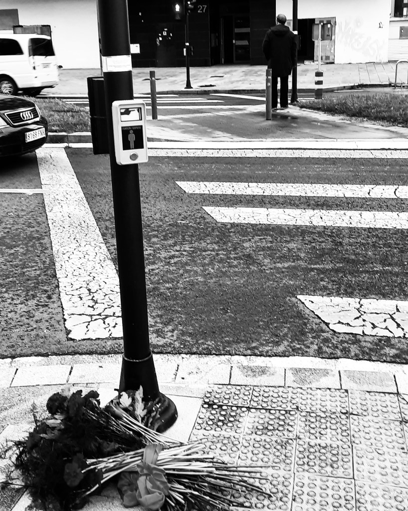 Octava pieza de la serie, consistente en la acción de calmar el tráfico del barrio de Zabalgana de Vitoria-Gasteiz por el procedimiento de atravesar continuamente en horas punta el paso de peatones en el que murió atropellada mi hija. La acción se concreta en el trasiego continuo de flores oscuras desde una acera a la acera opuesta, utilizando dicho paso. Las flores son transportadas de una en una o en pequeños ramos. Se recogen del suelo en una de las aceras y se depositan en el suelo de la acera opuesta. El movimiento se inicia y detiene en función de la intensidad y/o peligrosidad del tráfico. El propósito de la acción es forzar legalmente la parada de vehículos, ralentizar el tráfico en momentos de máxima afluencia, oponer mi cuerpo de peatón florido al exceso de velocidad de muchos vehículos.