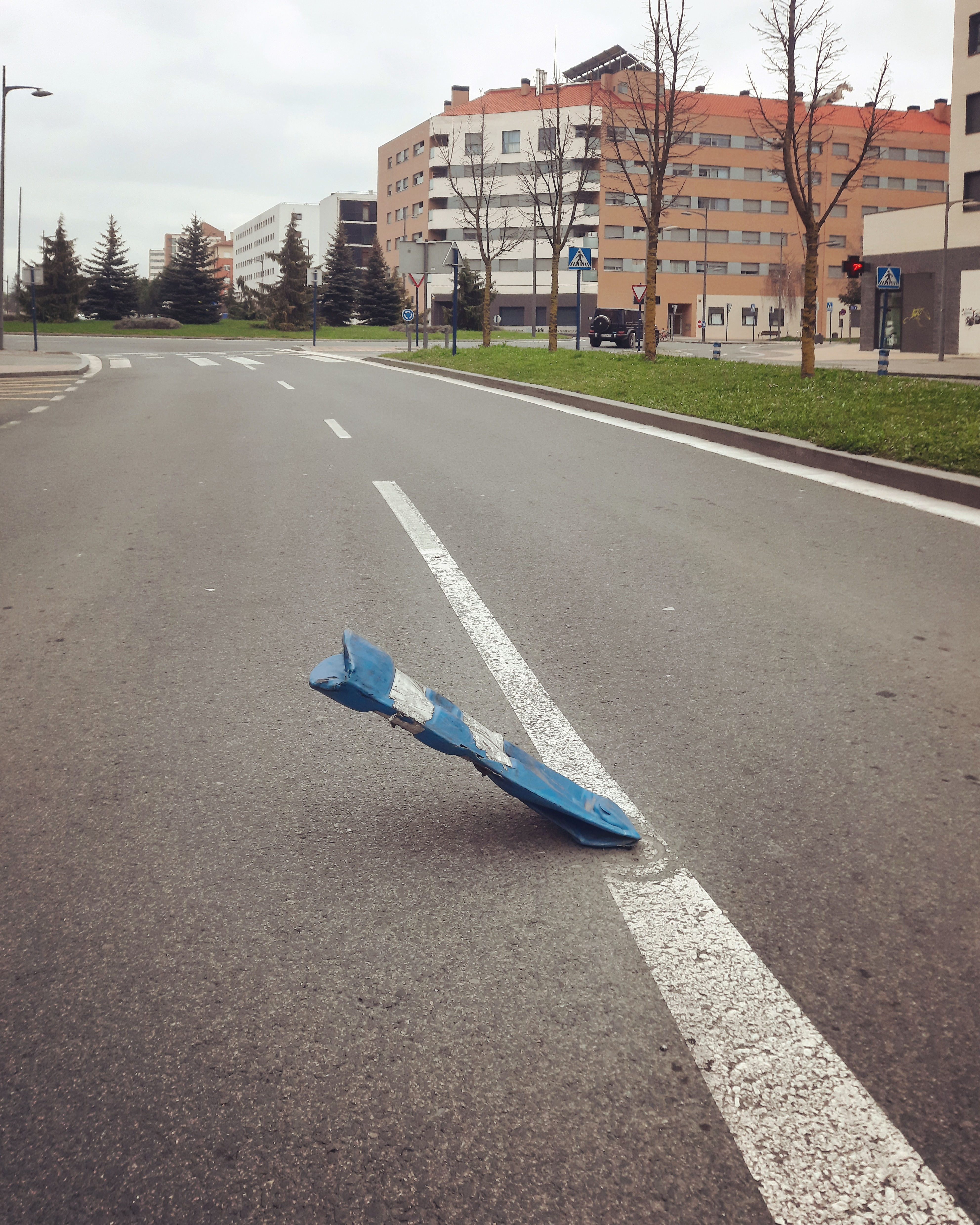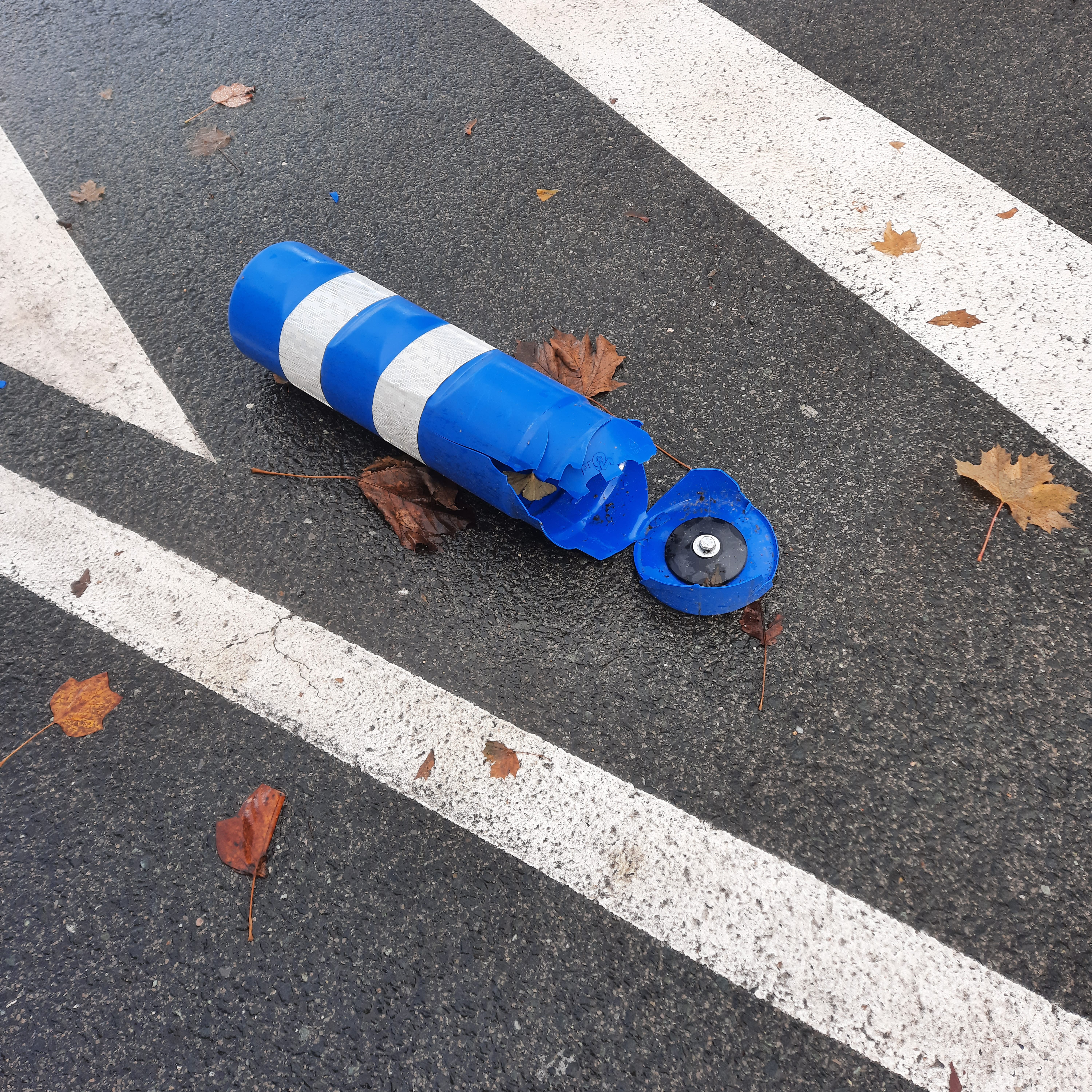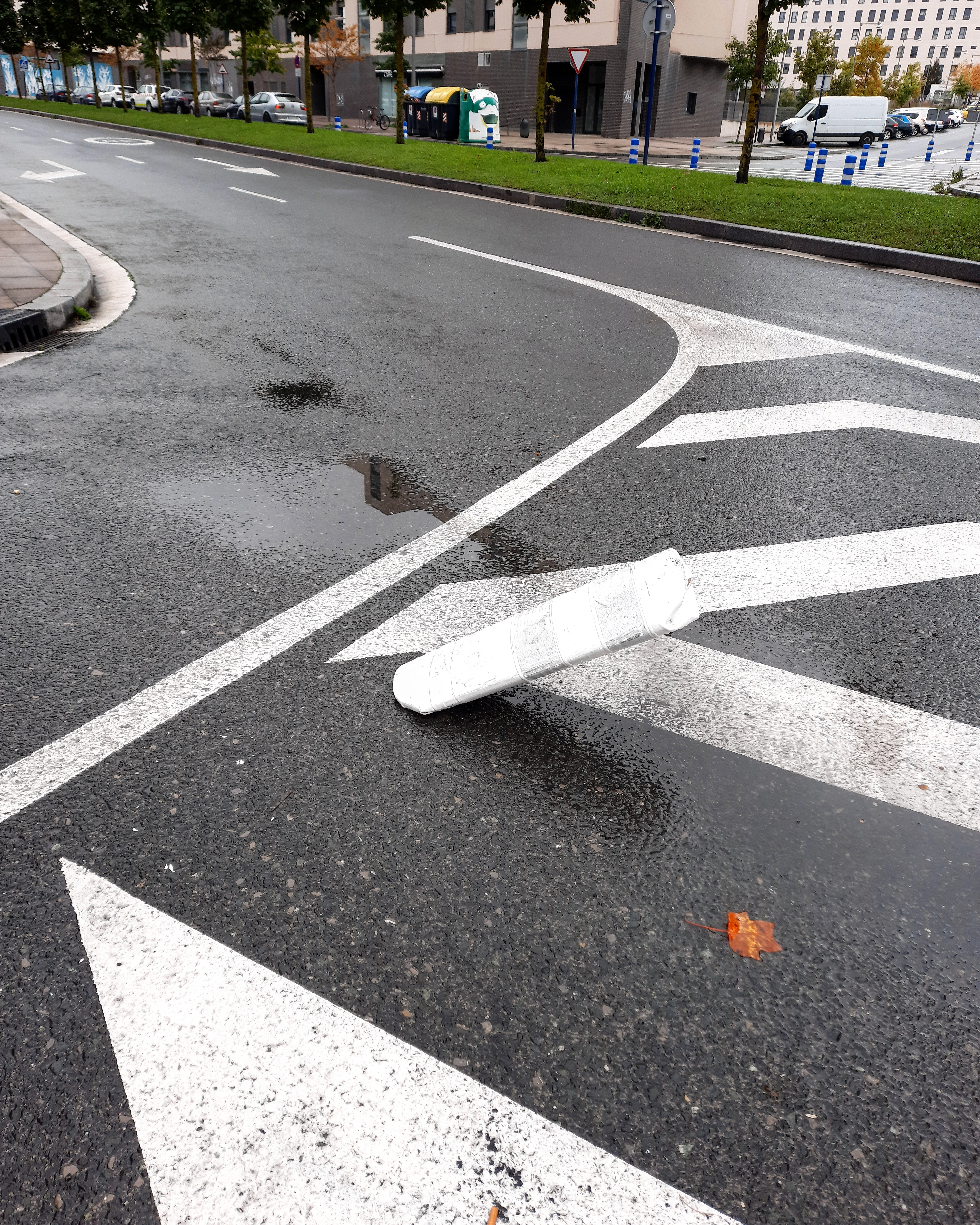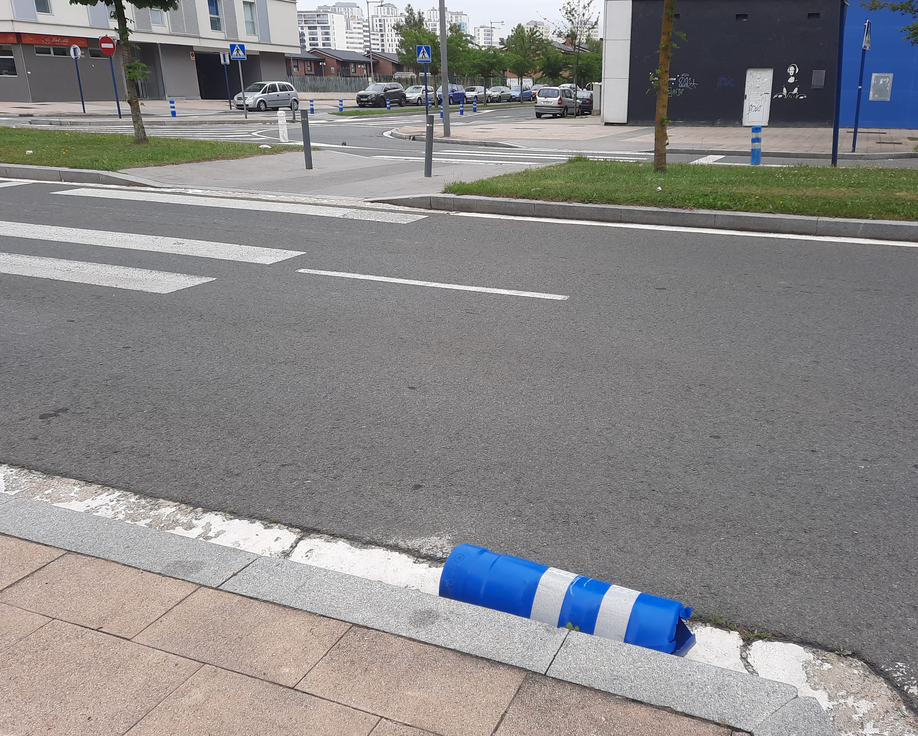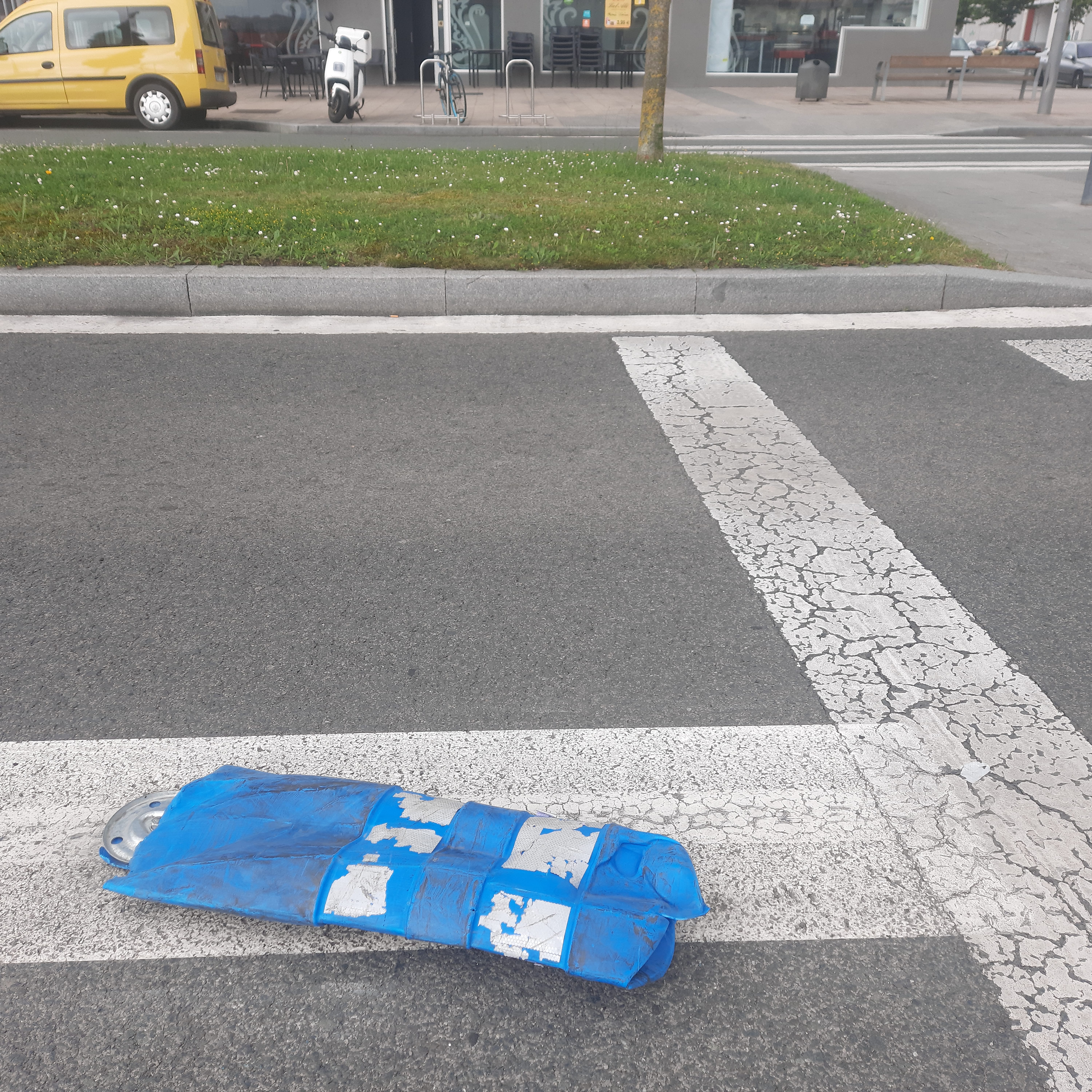 Baliza derribada junto al paso de peatones en el que mataron a mi hija. Fotografía realizada tres años después.Banal.