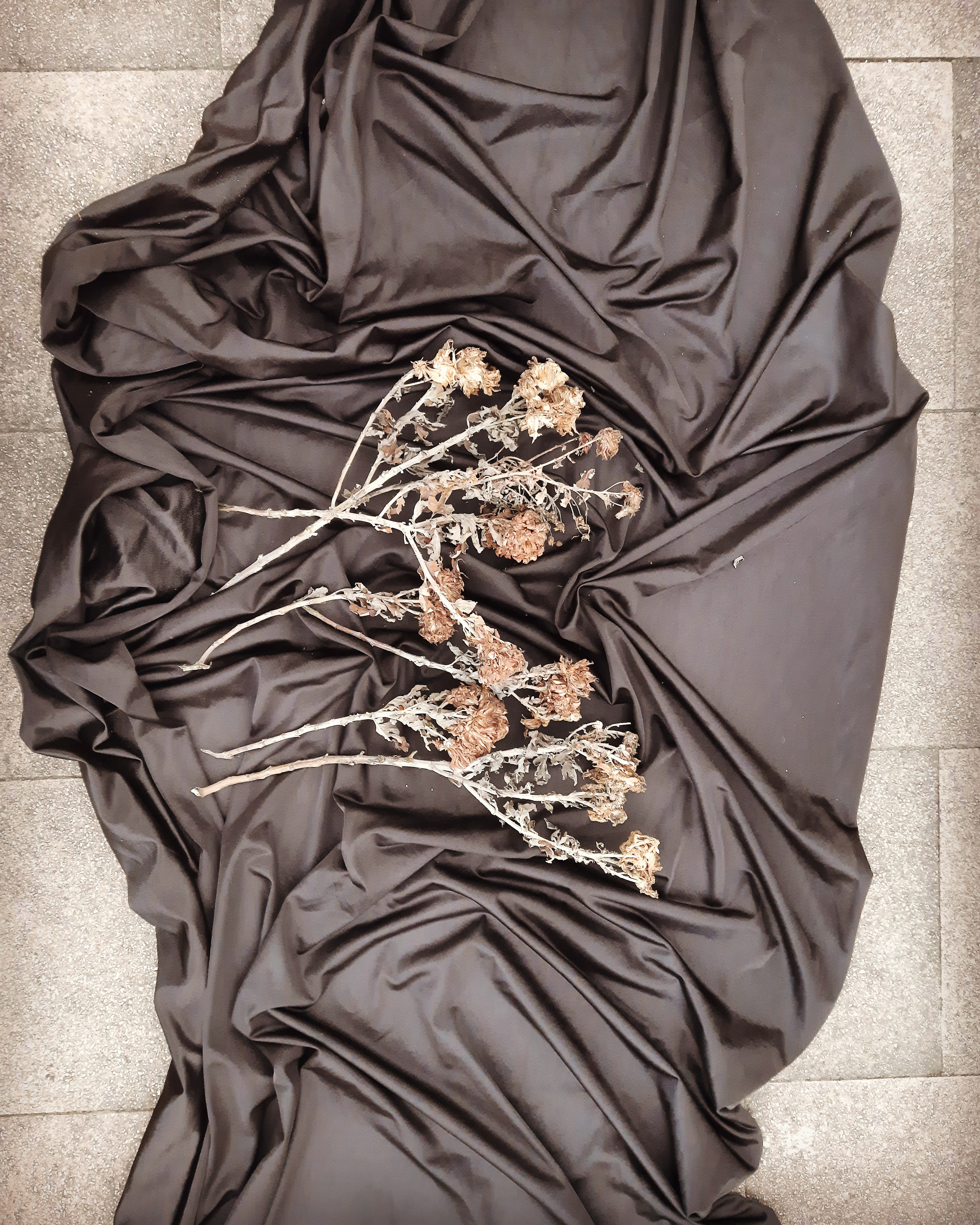 A variation of this piece consists of using withered flowers tied to nearby trees.