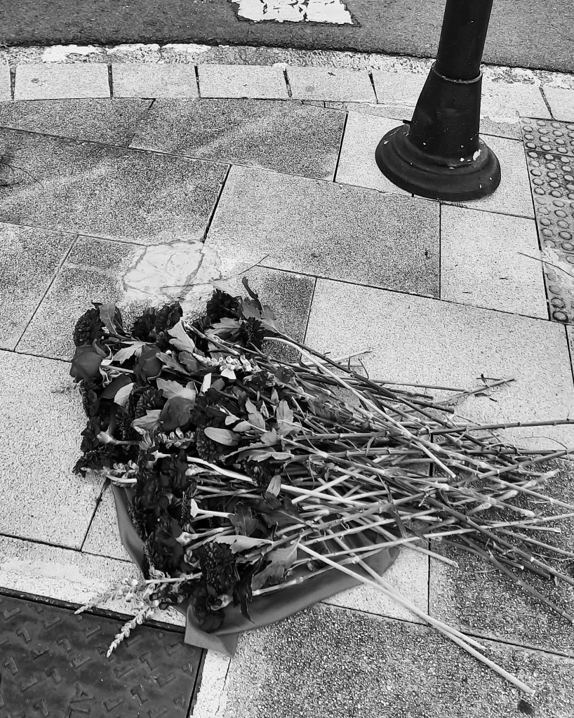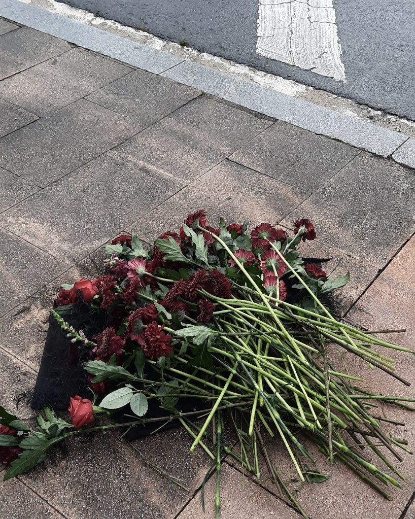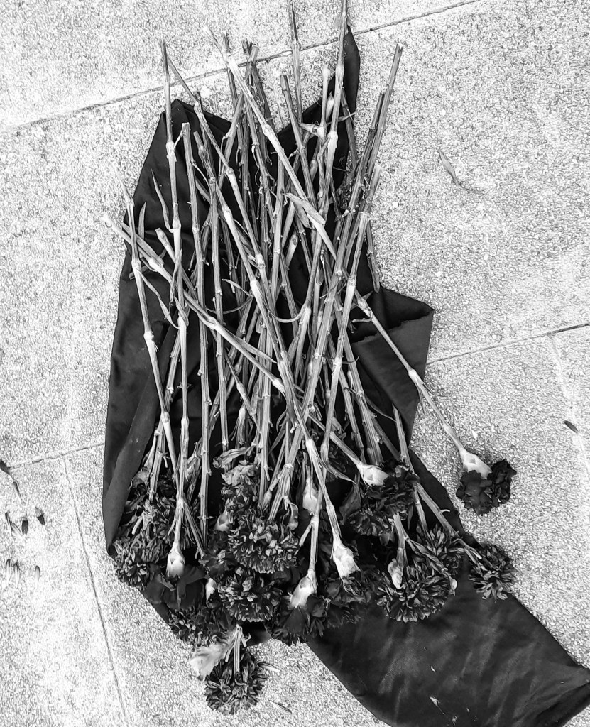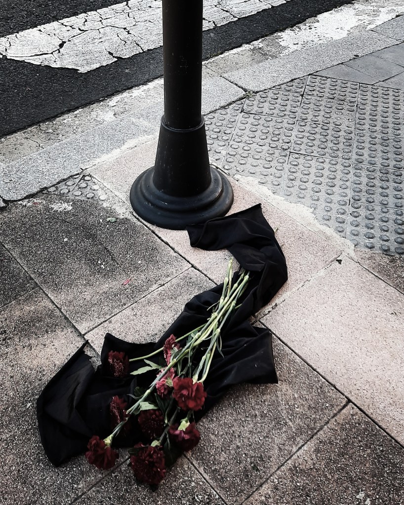Calming down traffic with whitered flowers. Heriotza-aurpegia. Rostro encontrado. No buscado.Calmando el tráfico con flores oscuras.