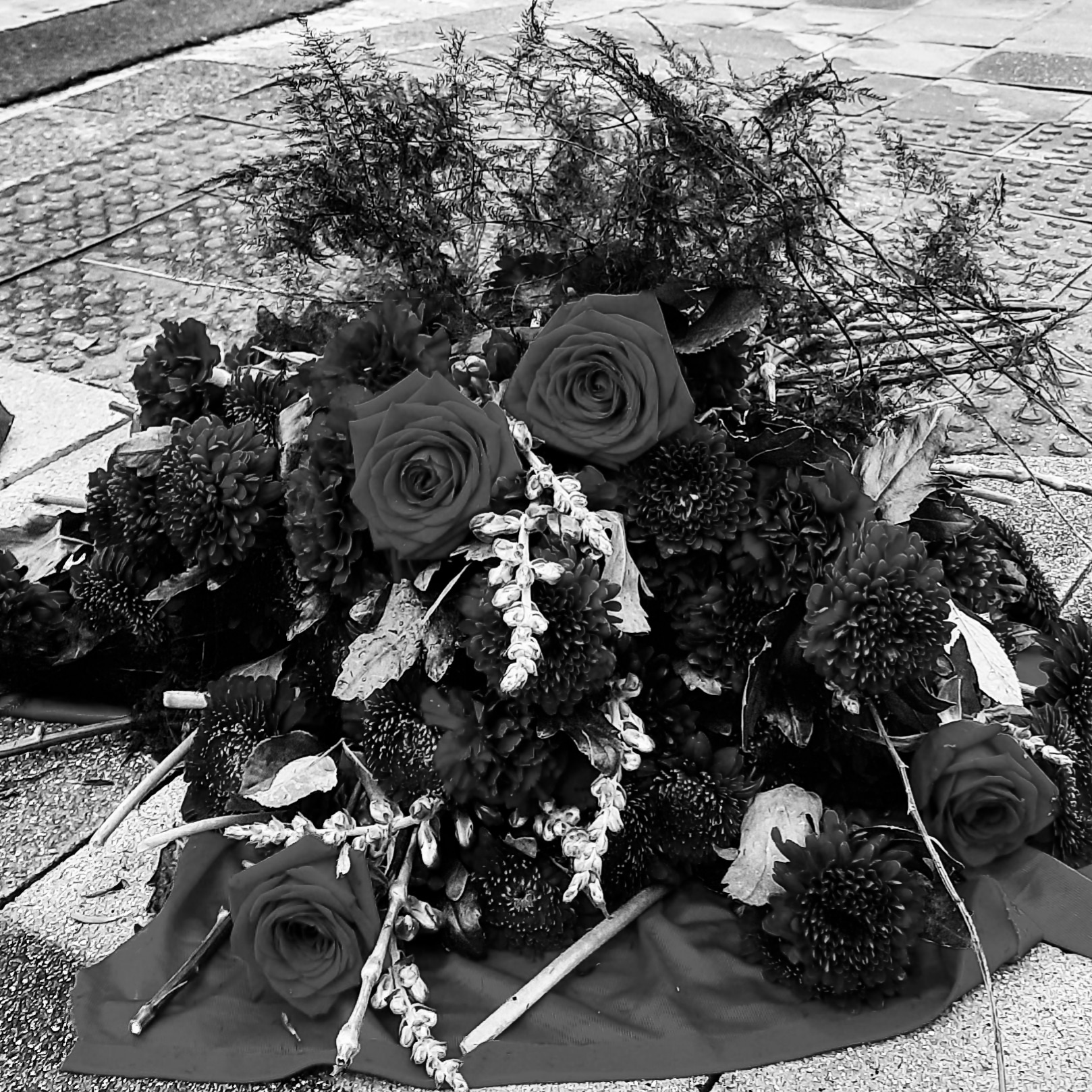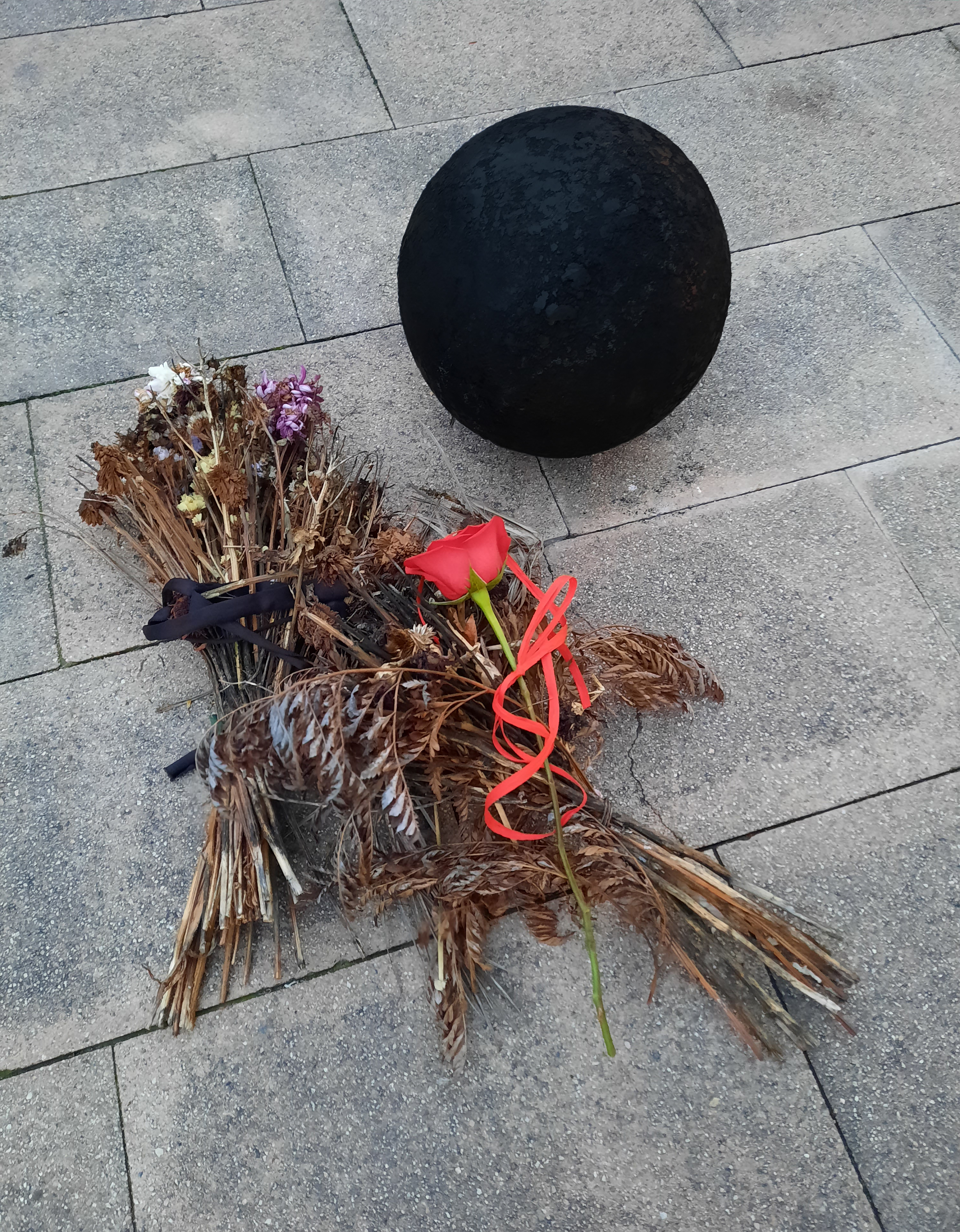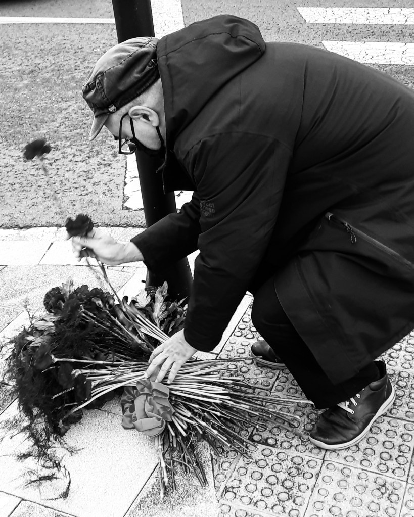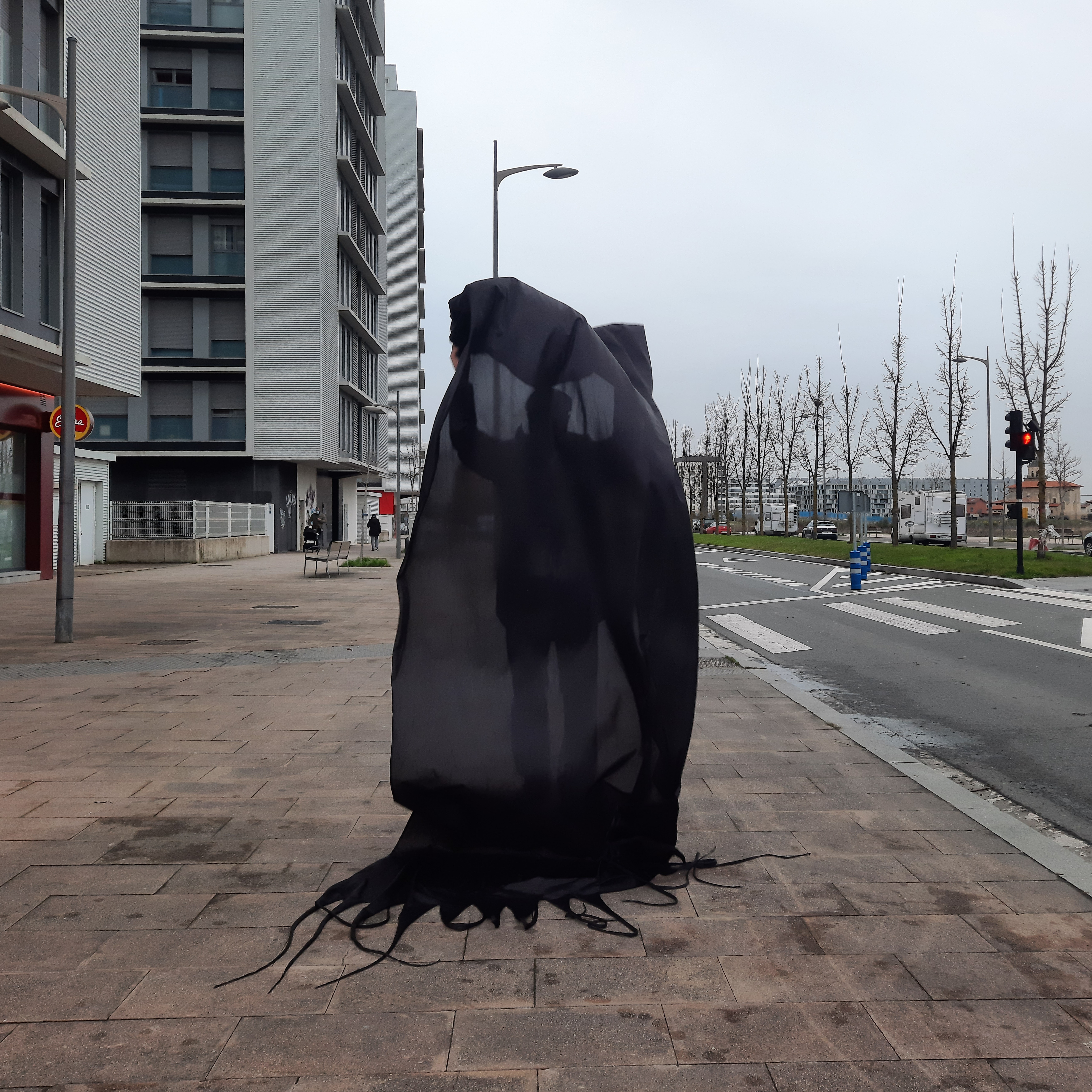 Calming down traffic with whitered flowers. Heriotza-aurpegia. Rostro encontrado. No buscado.Calmando el tráfico con flores oscuras.