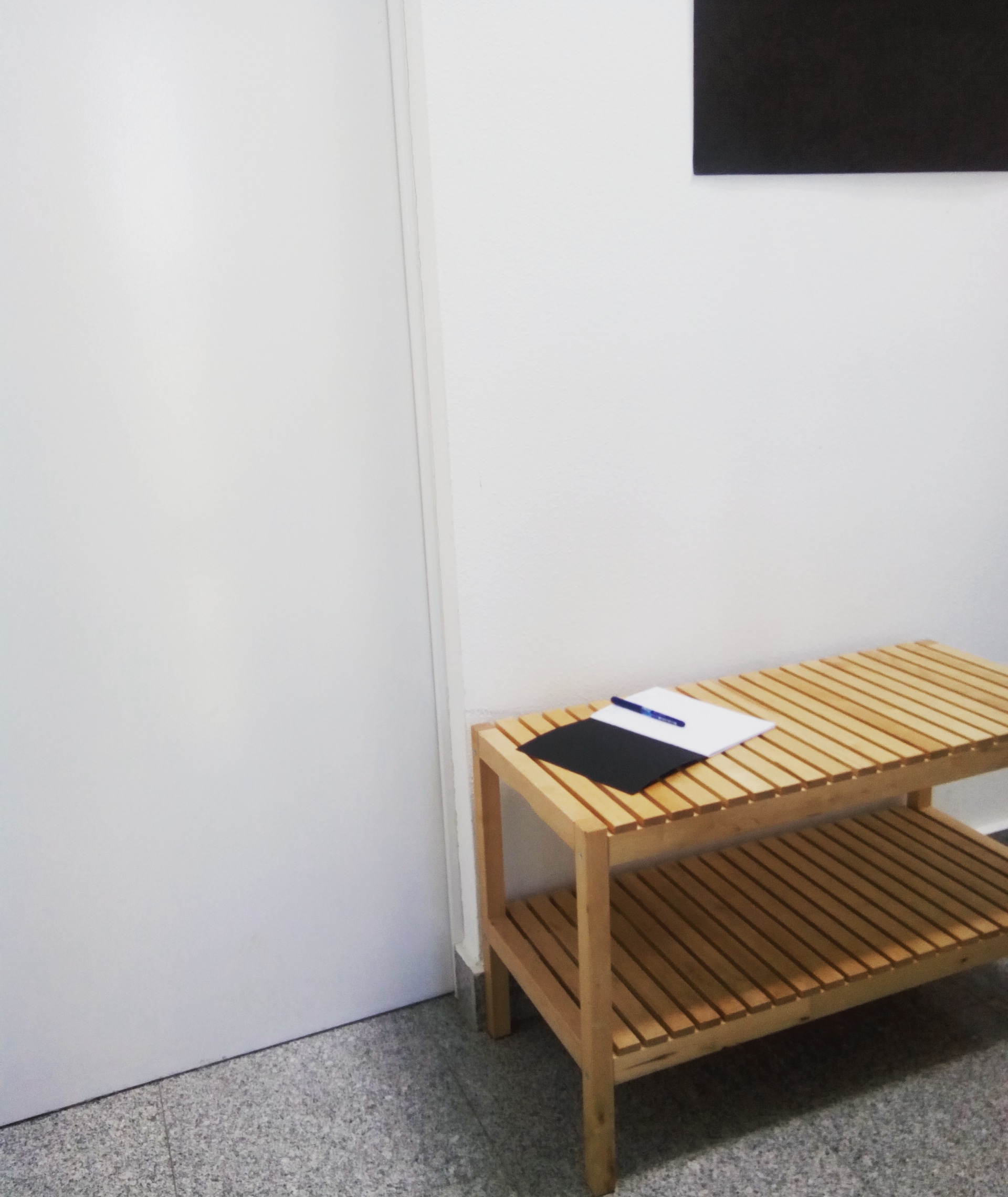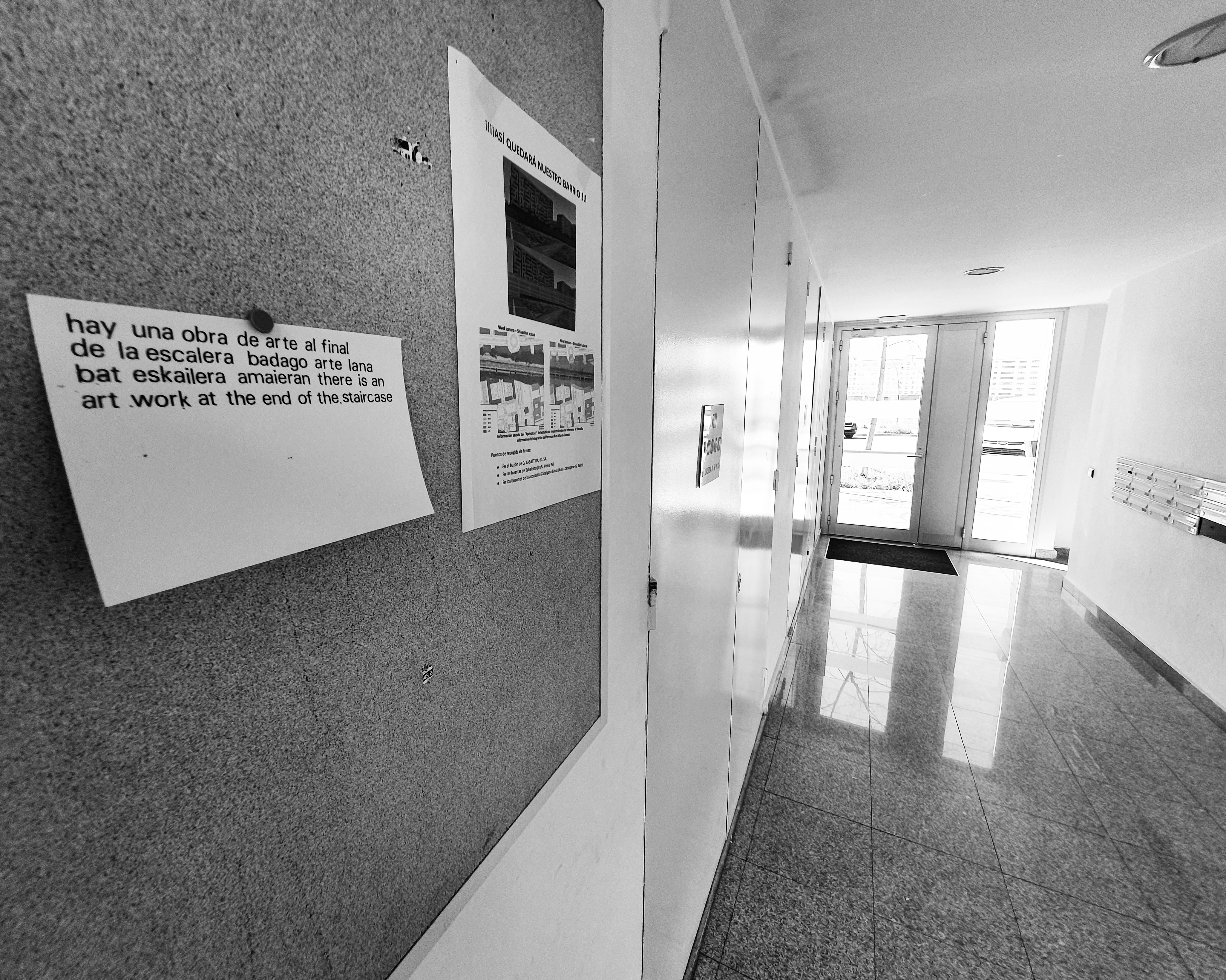 La obra se expuso por primera vez en el rellano del último piso de la escalera de mi bloque de viviendas. Circunstancia que fue debidamente comunicada a los vecinos mediante anuncio en el tablón comunitario.