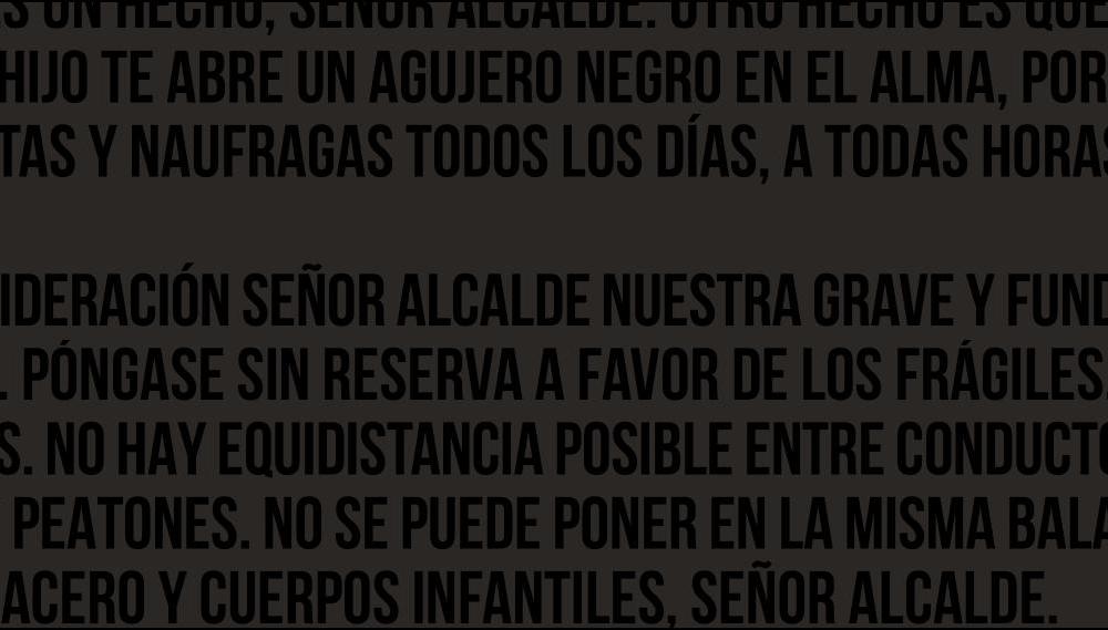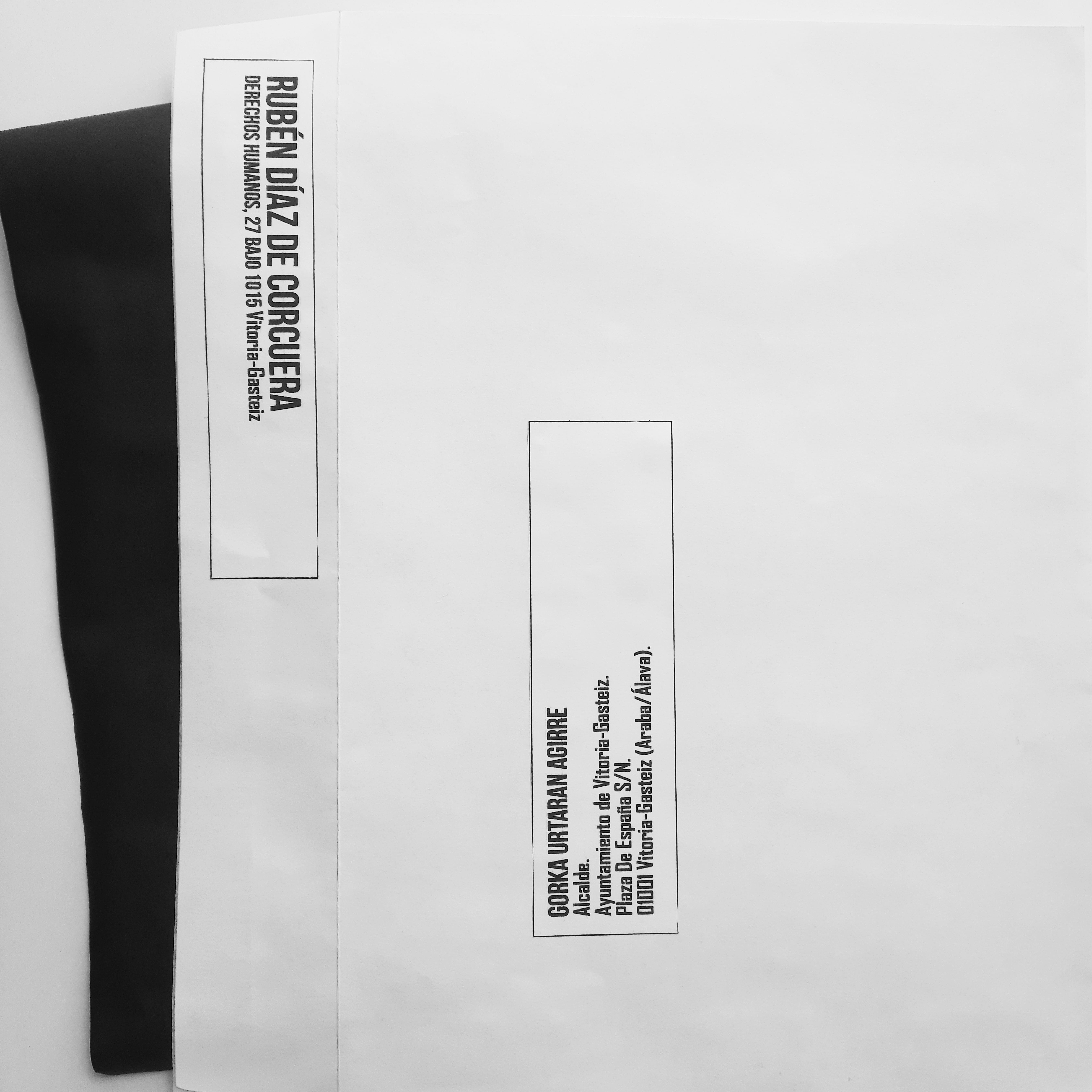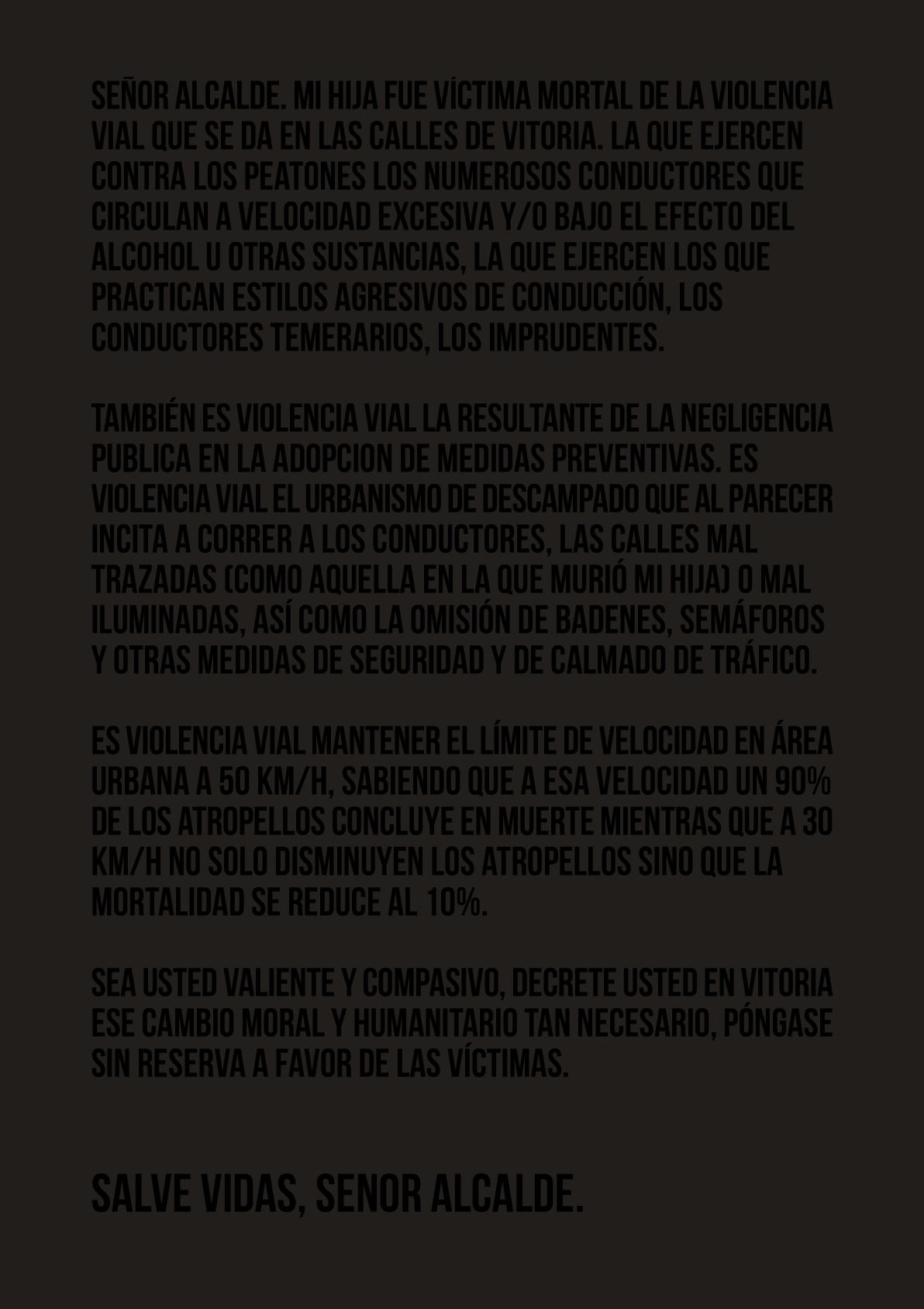 Cartas negras dirigidas al alcalde de la ciudad, señor Gorka Urtaran Agirre. Algunas incluyen palabras graves, apelaciones a su responsabilidad como máxima autoridad municipal para decretar un cambio, introducir un giro moral en las ordenanzas de tráfico. Otras adjuntan pequeñas travesuras de artista, extraña mezcla de humor y dolor, ironía trágica. En una, por ejemplo, al abrir el sobre postal se desparrama confetti negro sobre mesa y suelo. En otra, la carta tizna de negro las manos del que la toca.