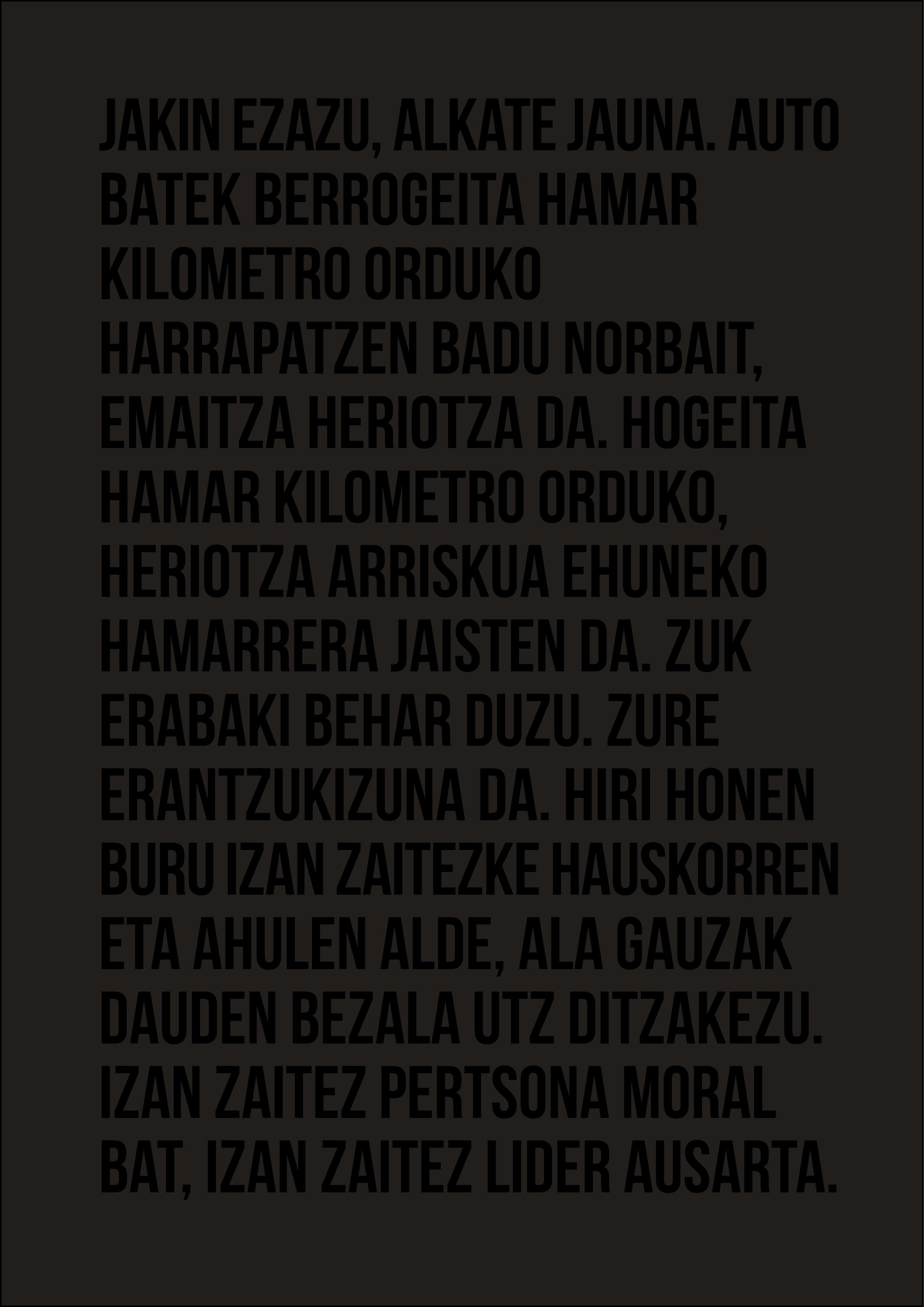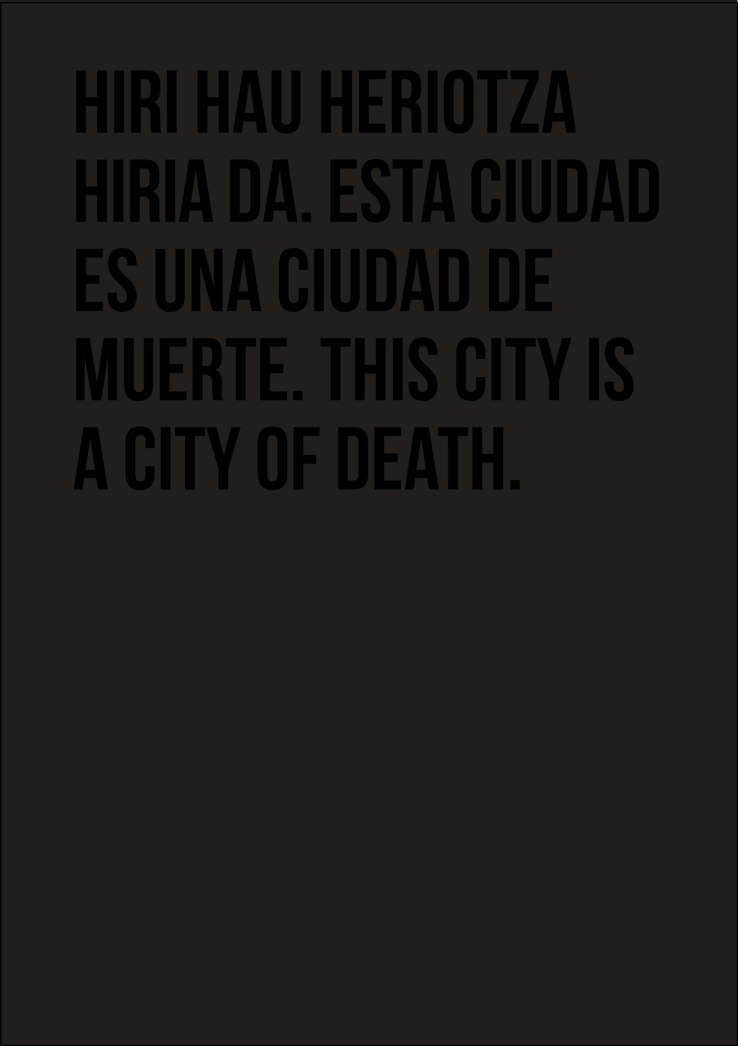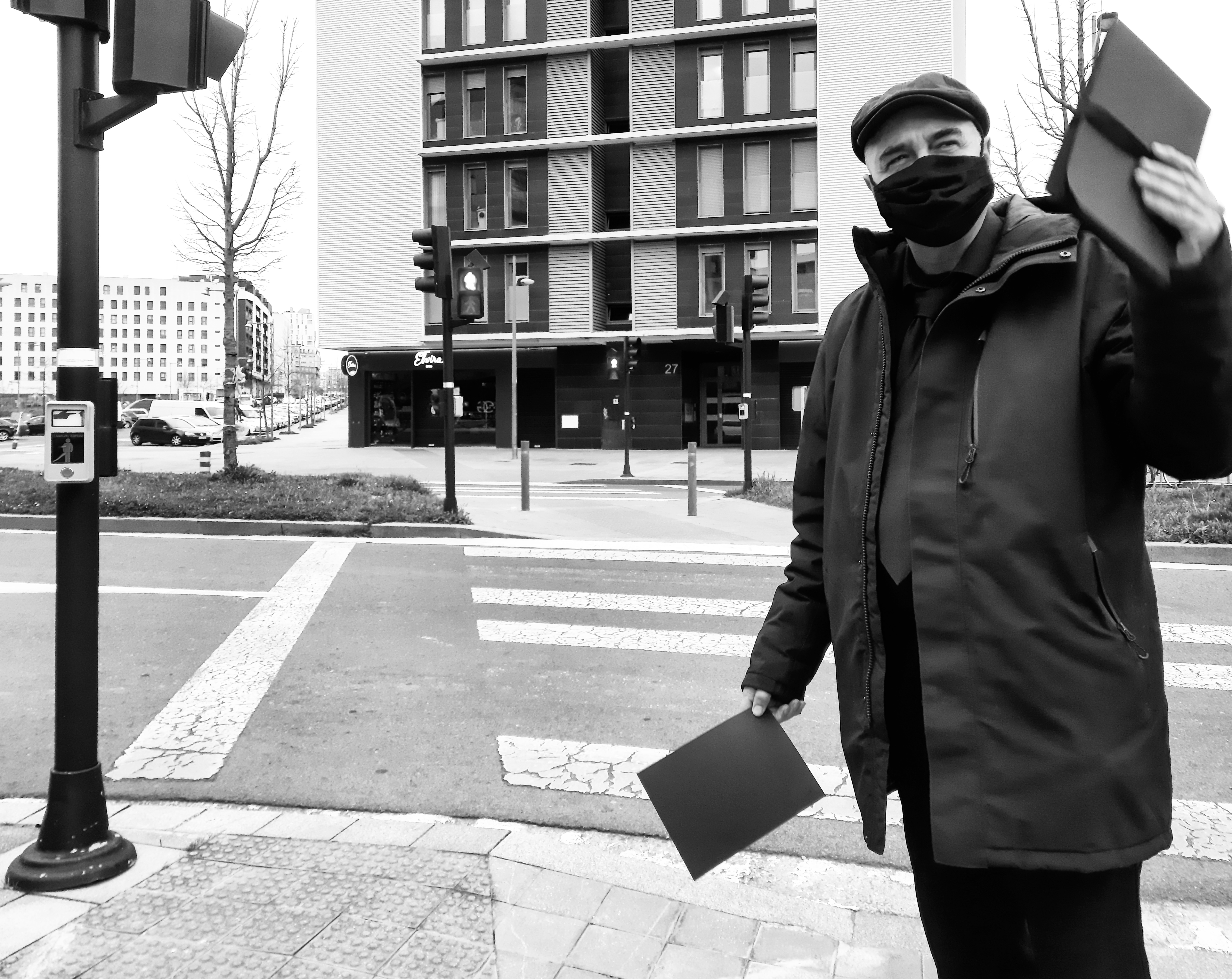 Cartas negras dirigidas al alcalde de la ciudad, señor Gorka Urtaran Agirre. Algunas incluyen palabras graves, apelaciones a su responsabilidad como máxima autoridad municipal para decretar un cambio, introducir un giro moral en las ordenanzas de tráfico. Otras adjuntan pequeñas travesuras de artista, extraña mezcla de humor y dolor, ironía trágica. En una, por ejemplo, al abrir el sobre postal se desparrama confetti negro sobre mesa y suelo. En otra, la carta tizna de negro las manos del que la toca.