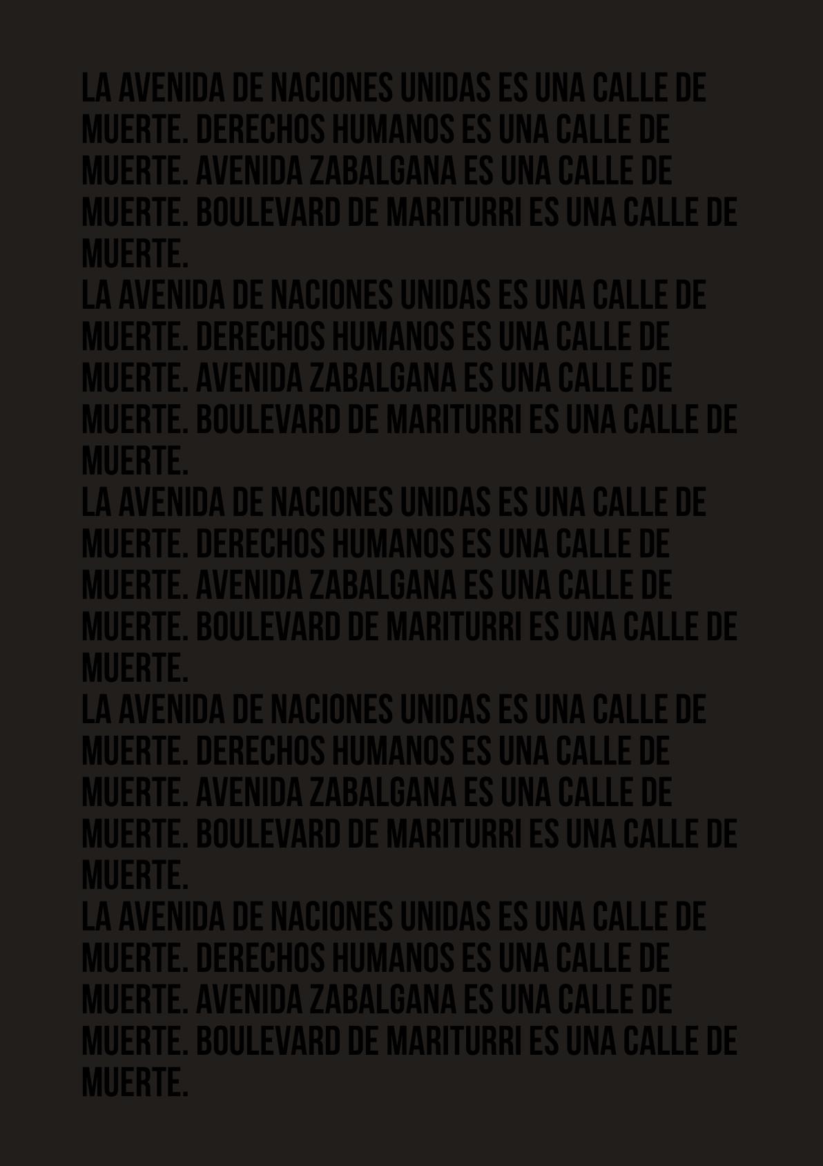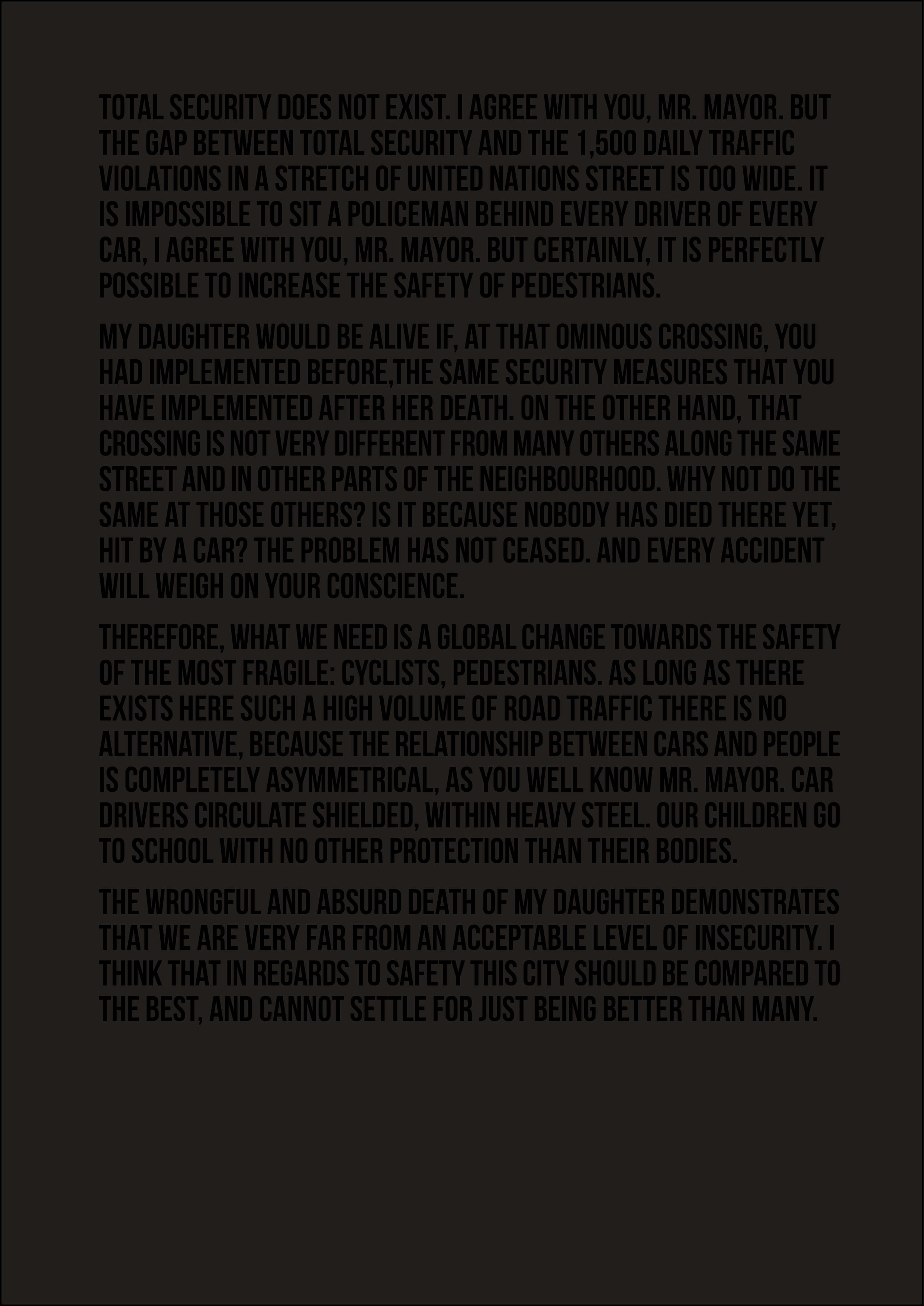 El carácter estético o expresivo de este documento reside en el hecho singular que anticipa: la realización de una manifestación de una sola persona, portando en cada ocasión no una pancarta sino uno de los siguientes objetos: una bandera negra, ese mismo paño como velo, una esfera de granito negro pintada de negro, una silla, una camiseta negra, una señal de tráfico o nada en absoluto. La concentración se realiza como se indica, en la Avenida Naciones Unidas número 27, frente al paso de peatones en el que murió atropellada mi hija.