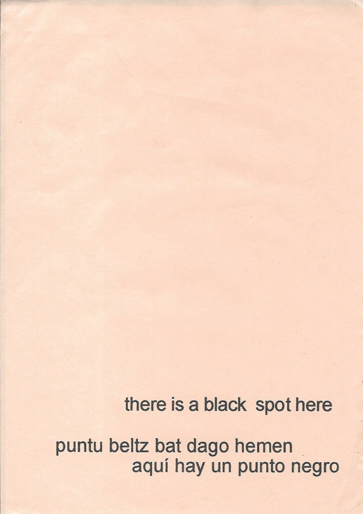 Carta negra #01. Papel negro A4, impresión digital con tinta negra, sobre postal blanco. Black letter #02. Papel negro A4, impresión digital con tinta negra, sobre postal blanco. Gutun beltza #03. Papel negro A4, impresión digital con tinta negra, sobre postal blanco. Carta negra #04. Papel negro A4, impresión digital con tinta negra, sobre postal blanco. Carta negra #05. Papel negro A4, impresión digital con tinta negra, sobre postal blanco. Gutun beltza #06. Papel negro A4, impresión digital con tinta negra, sobre postal blanco. Incluye un girón de tela negra de mi bandera de duelo. Carta negra #7. Papel negro A4, impresión digital con tinta negra, sobre postal blanco. Carta negra #8. Papel negro A4, impresión digital con tinta negra, sobre postal blanco. Gutun beltza #9, Papel negro A4, impresión digital con tinta negra, sobre postal blanco. Carta negra #10. Papel negro A4, confetti de cartulina negra, sobre postal blanco. Carta negra #11. Papel negro A4, adhesivo en spray, pigmento black de Stuart Semple, sobre postal blanco.Carta negra #12. Papel negro A4, pintura acrílica black de Stuart Semple cubriendo completamente el papel negro, sobre postal blanco.13 black letters.