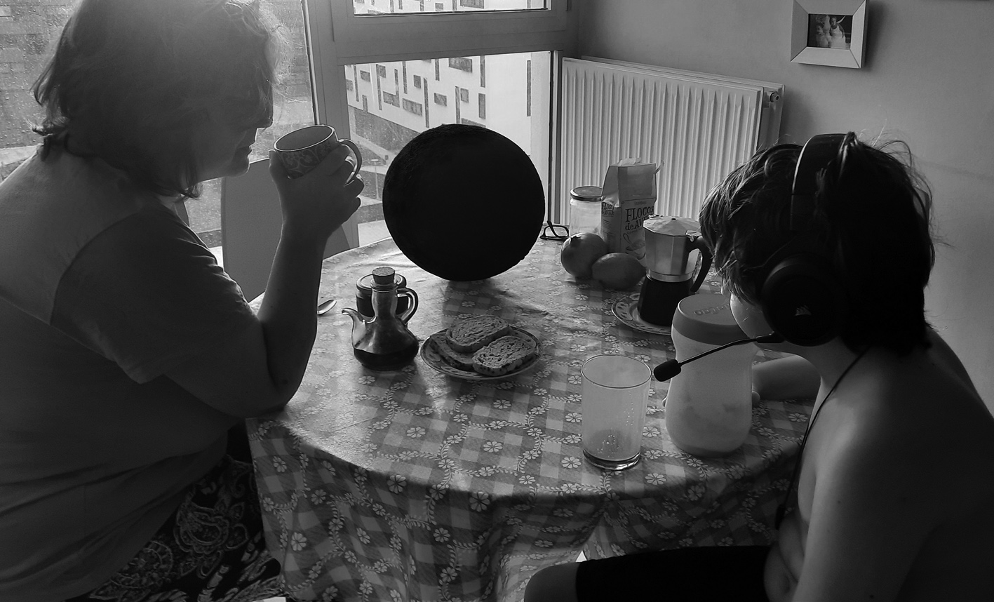 Primera pieza de la serie y la que da título al conjunto. Dibujo a pluma, rotulador y bolígrafo (todos los utensilios de grafismo fino y color negro que pude reunir al principio del confinamiento). Trabajo materializado por el procedimiento de garabatear incesantemente sobre una cartulina blanca de 74,5 x 60,5 cm. con la intención de cubrirla completamente. La vida de los rotuladores fue alargada al límite añadiendo alcohol a los depósitos (en concreto el alcohol de ciertos frascos de colonia infantil que habían quedado en desuso). De lo cual resultó una obra con exceso de buen olor, casi fétida. Me temo que las fotografías no pueden hacer justicia a la colusión de este olor empalagoso con el vibrante negro, los apretados arabescos de brillos cobrizos que colman el plano.