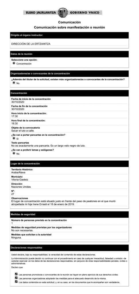 Formalización en blanco y negro del impreso o formulario que debe rellenarse y enviar a la dirección de la policía vasca para comunicar con alguna antelación la realización de una manifestación o concentración en la calle.